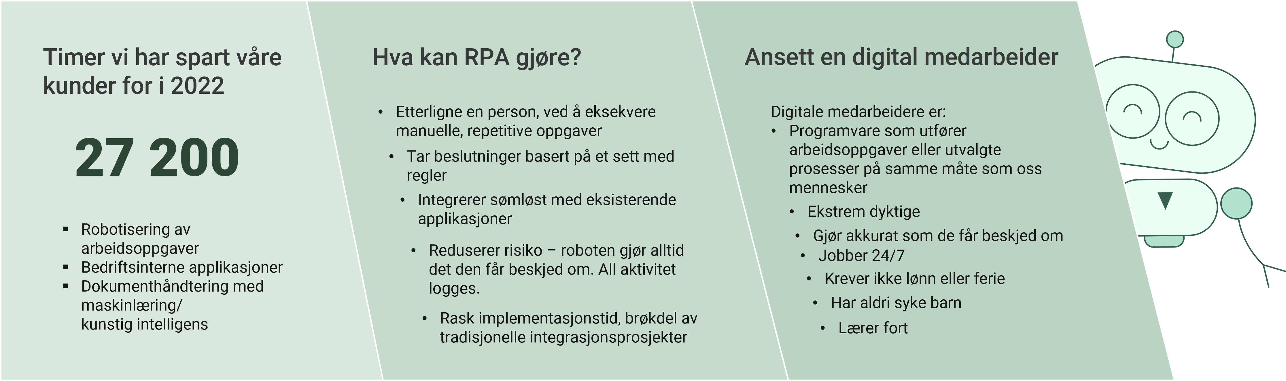 Vi jobber daglig med å ta roboten ut av de ansatte for våre kunder og har i dag drift av rundt 40 prosesser for mellomstore og store bedrifter. Det gjør vi gjennom vår Robot as a Service, hvor vi har ansvaret for drift, support og vedlikehold av de robotiserte arbeidsprosessene.